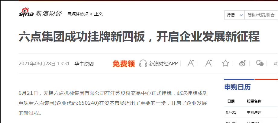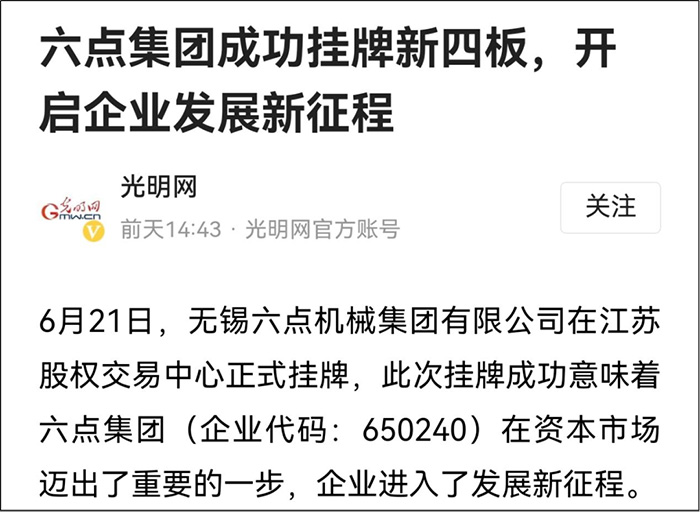 2021年6月21日,無錫六點(diǎn)機(jī)械集團(tuán)有限公司正式掛牌新四板,企業(yè)代碼:681294,吊籃租賃領(lǐng)域掛牌新四板的企業(yè)橫空出世,多家新聞網(wǎng)站競相報(bào)道。六點(diǎn)集團(tuán)用6年的時(shí)間,從默默無聞到行業(yè)黑馬,成為了大家關(guān)注的焦點(diǎn),連主流媒體光明網(wǎng)、新浪財(cái)經(jīng)、網(wǎng)易財(cái)經(jīng)等門戶網(wǎng)站也發(fā)文報(bào)道。