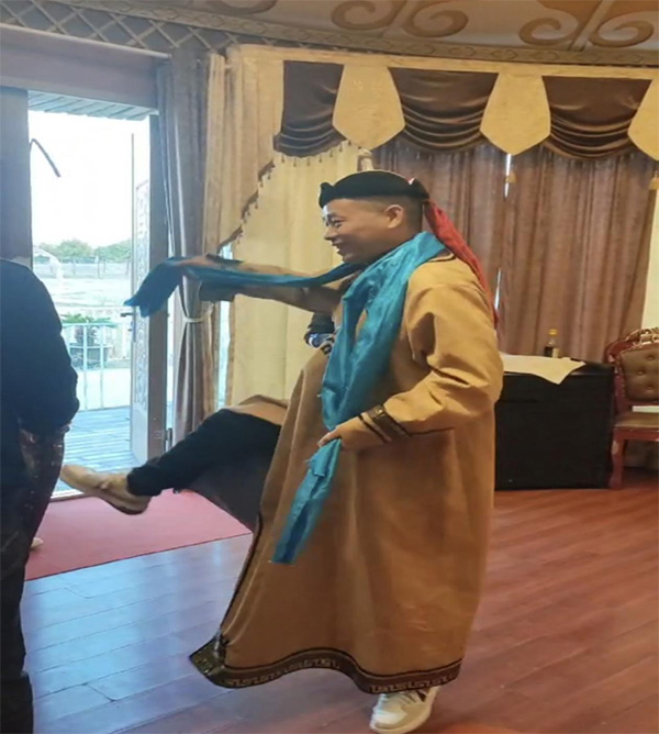 在空巴晚宴上,大家體驗(yàn)到了專業(yè)的蒙古族烤全羊開羊儀式。當(dāng)烤全羊上席時(shí),香氣四溢,掌聲四起,工作人員為大家獻(xiàn)上了藍(lán)色的哈達(dá),表達(dá)對(duì)大家的熱烈歡迎。